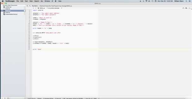 <p> import smtplib</p><p>smtpUser = 'Your gmail email address' smtpPass = 'Your gmail password' toAdd = 'email to send to' fromAdd = smtpUser subject = 'Happy Pi Day!!!' header = 'To: ' + toAdd + '\n' + 'From: ' + fromAdd + '\n' + 'Subject: ' + subject body = 'This is a message from a Python Script saying: Happy Pi Day!!!' print header + '\n' + body s = smtplib.SMTP('smtp.gmail.com',465) s.ehlo() s.starttls() s.ehlo() s.login(smtpUser, smtpPass) s.sendmail(fromAdd, toAdd, header + '\n\n' + body) print 'done' </p> Si eso no funciona puede descargar GMAIL.py y ejecute en su lugar.