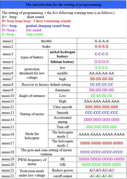 * Se escuchará los sonidos que se describen en el cuadro (fuente: Manual: http://www.hobbyking.com/hobbyking/store/uploads/811103388X7478X20.pdf)