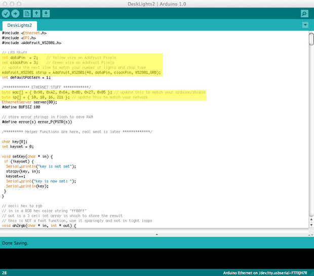 Tendrás que cambiar la dirección MAC para que coincida con tu escudo Arduino ethernet, la dirección IP para que coincida con su red, el número de luces para que coincida con su filamento de la luz y la función de red para que coincida con su disposición física.