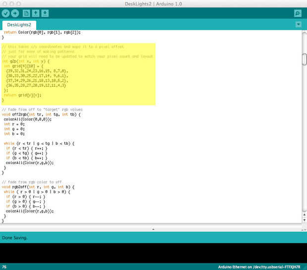 La función de red puede ser la más delicada. Toma una coordenadas x.y y mapas para el índice numérico de la luz en el filamento. Por suerte algunos experimentos hace que sea muy obvio que las luces que son.