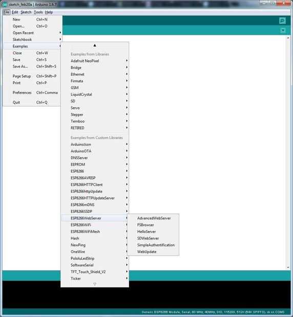 Abrir el IDE de Arduino. Tengo la version 1.6.7. Tuve que añadir tablero personalizado para ESP. Esto se puede manejar fácilmente a través de la opción del menú Preferencias en el menú archivo.