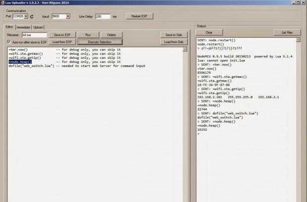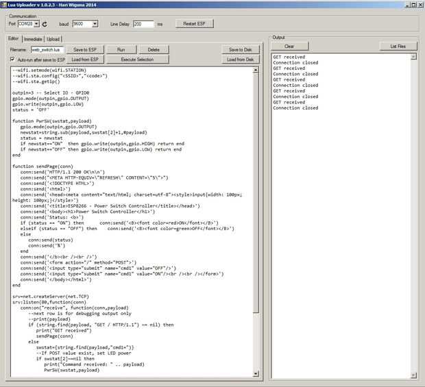 Guardar el código de ESP como 'init.lua', reinicie ESP. Debe reiniciar y reiniciar automáticamente el programa y reiniciar el servidor Web: