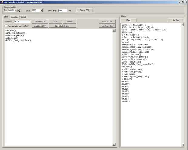 tmr.now() -- for debug only, you can skip it wifi.sta.getmac() -- for debug only, you can skip it wifi.sta.getip() -- for debug only, you can skip itnode.heap() dofile("web_temp.lua") -- needed to start Web Server and Temperature logger Guardar el código de ESP como 'init.lua', reinicie ESP. Se debe reiniciar y reiniciar el programa y reiniciar el servidor Web.