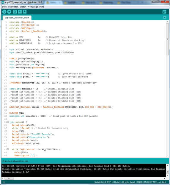 El código está bien explicado. Sólo tienes que poner en tu SSID (nombre) de tu red wifi (Codeline 18) y la contraseña (Codeline 19), en lugar de las estrellas. Si no eres de Europa Central también puede cambiar la zona horaria.