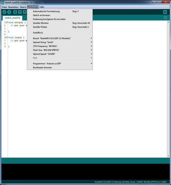 Trabajo con el IDE de Arduino 1.6.7. Es fácil y sencillo de utilizar. Configurar el IDE para la ESP8266 es fácil y hay muchos instructables aquí, así que no quiero aburrir con este paso. Si empezar a programar el ESP8266 debería verse como en la primera foto. Se trata de la configuración que uso para el ESP8266 nodo-MCU 0.9.