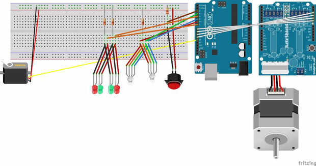 Vamos a utilizar resistencias de 220 ohmios para todas las resistencias anteriores. Para comenzar con alambre el botón como se muestra en la foto de arriba. Simplemente trata de cableado tanto uno de los extremos a 5 voltios y un extremo a tierra y colocando el cable del puerto 2 de la Arduino somwhere en serie. Continuación cable del RGB de led. Usé de LED de cátodo común por lo que tienen un alambre va a 5 voltios en vez de tierra. Estos cables a los 6, 3 y 5, para las clavijas rojo, verde y azul respectivamente. A continuación dos cable sólo tiene que colocar el color del LED 5 Voltio largo pines para 7 y 4 pines de Arduino como se muestra y los otros pines a tierra a través de una resistencia de 220 ohm. Por último cable del servo a la clavija 12 y el motor paso a paso a los pines 8-11 usando el escudo con el motor paso a paso asegurándose de cable 5 voltios y tierra en el escudo.