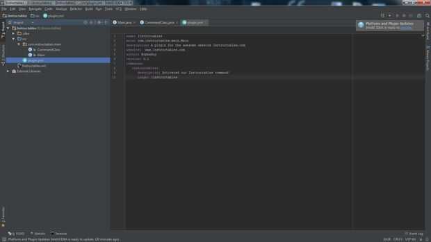 if (commandSender instanceof Player) { Reemplace instructables con lo que llamó su comando (Nota Esto debe ser lo mismo que el comando que pones en la clase de comando). Lo que hace este código, es la primera línea, comandos:, inicia una lista en YML (el tipo de archivo plugin.yml ), y luego donde pongo instructables y pones el nombre del comando, empieza otra lista dentro de esa lista de comandos . Tenga en cuenta, si usted tiene muchos comandos, asegúrese de que todos están en la lista de comandos , no del una comando lista. En esta lista de Comando su , estamos definiendo dos cosas. La primera parte, Descripción, es la descripción de que nuestro servidor dice cuando hacemos/ayuda. Esto puede ser lo que quieras. Otro uso, es el uso /help muestra. Por lo general, no confundir al jugador, pondría allí su comando y argumentos, que revisaremos más adelante.