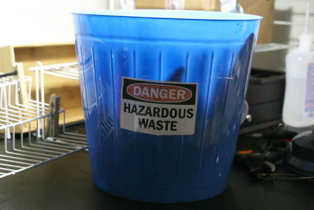 Residuos: El laboratorio debe estar meticulosamente limpio mientras no esté en uso. Debe haber dos receptáculos de residuos separados: un cubo de plástico para residuos peligrosos (es decir, cristales rotos, sustancias inflamables) y otro para la basura regular. Para productos químicos peligrosos, métodos de eliminación son generalmente en las etiquetas de las botellas. En caso de duda, hacer una investigación sobre reciclaje y recolección de centros locales.