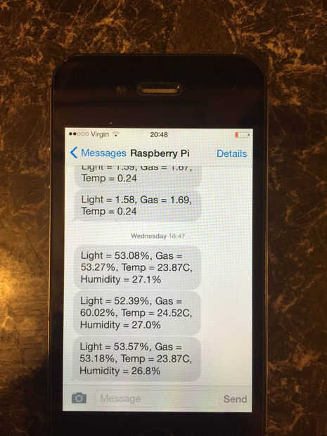 En esta etapa todo debe todos ser cableado y listo para probar un funcionamiento en seco. He escrito un programa python bastante simple que tome las lecturas de cada sensor y luego enviar los resultados a su teléfono móvil. Puede descargar el programa completo de la Página de PiJuice Github. Ahora también podría ser un buen momento para probar con el módulo PiJuice. Simplemente enchufa de GPIO de la Raspberry Pi, todos los cables conectados a la Pi sólo haz conectados directamente a las salidas de pin correspondiente en el PiJuice. Fácil como Pi. Para descargar el código utilice el comando: