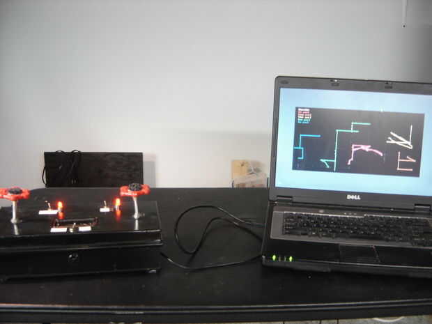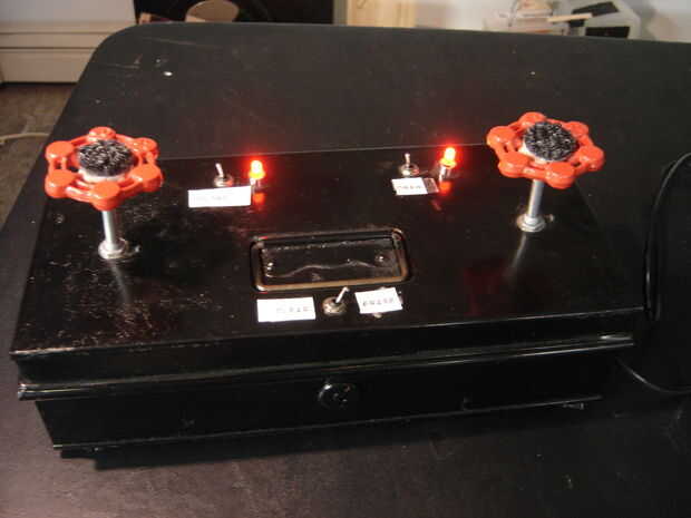 Un Arduino Duemilenova que está ubicado en una vieja caja fuerte de banda. El Arduino tiene 2 potenciómetros conectados a él. Uno representa el eje x y el otro el eje y coordenadas. Pegué algunos rojo valores asas a los cacharros de plomería. Como uno da vuelta a las ollas, la salida va a los pines analógicos 0 y 1. Esto se asigna un valor entre 0 - 1023 para x e y coordenadas.