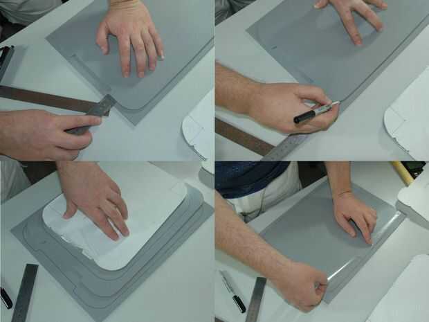 Como se indicó anteriormente la simetría es fundamental. Para medir la diferencia de tamaño entre el soporte de motor y tapa falsa. Luego marcar mitad de esa distancia en la parte posterior del soporte del motor con un lápiz. Finalmente utilice el lápiz para trazar todo el camino alrededor de la tapa falsa.