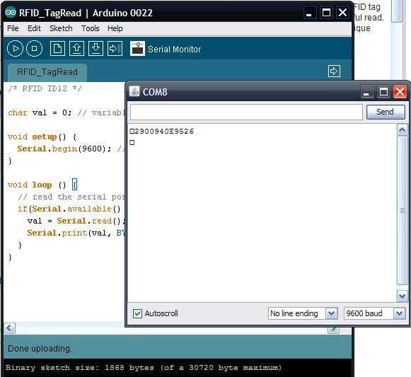 Copie el código abajo y pegarlo en un nuevo dibujo. Verificar, recopilar y subir. Cuando ha terminado de subir, pasar la etiqueta de RFID por el lector. Si tienes el pin LED en el ID-12 conectado a un LED, debe ver el centelleo del LED. Esto indica un éxito Lee. Si Arduino está conectado y funciona correctamente, debería ver 12 caracteres hexadecimales en el monitor serie. Este es el identificador único de la etiqueta.
