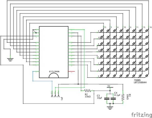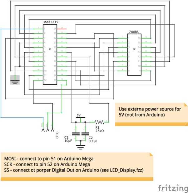 tienes que cablear conexión al chip MAX. Sólo tienes que tener en cuenta, que sombrero de máximo dos juegos de pernos, que son relevantes aquí: Dig0 Dig7 deben conectarse a cátodos (-) y SegA-SegG a anodes(+). Además de estos cambios intercambian filas con columnas de módulo LED de seno.