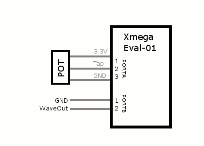 Añadiendo un 3pin ajustables potenciómetro a PortA en el XMega Eval01 podemos crear este simple divisor de tensión. Usted puede también alimentar en su propia fuente de voltaje de entre 0-1.6V para hacer el ajuste en su lugar.