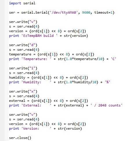 import serial ser = serial.Serial('/dev/ttyAMA0', 9600, timeout=1) Ahora, vamos a consultar el sensor para el valor de la construcción. Es un valor estático que identifica la versión de la EzTemp.