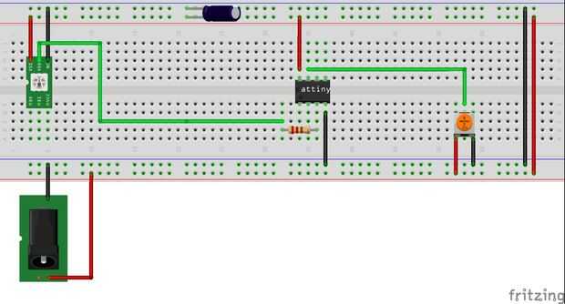 Retire los cables de la Arduino, alambre en su barrica jack u otro poder suministrar y conectar a los cables de alimentación y tierra a su 85 ATTiny debe y funcionamiento con su ahora shrinkified proyecto. Su programa debe trabajar como antes y comportarse bien. Juega con el potenciómetro, asegúrese de que todo funciona. Si es así, estás listo para pasar a soldar todo a su tablero de perf.