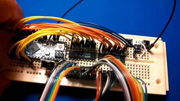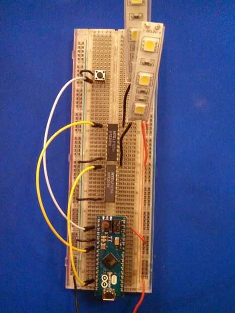 5. la primera imagen arriba da un diagrama de cableado simplificado mostrando el protoboard, micro arduino, el arreglo de dos transistores ICs (cada uno conectado a tierra y los pines 3 y 11, respectivamente), un segmento del LED correspondiente en cada chip y uno de los tres botones.