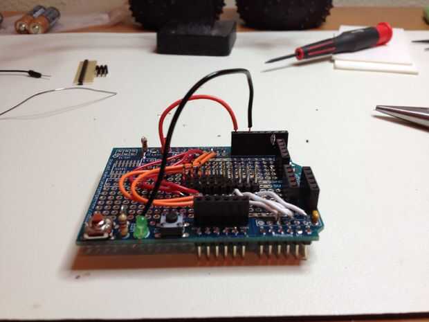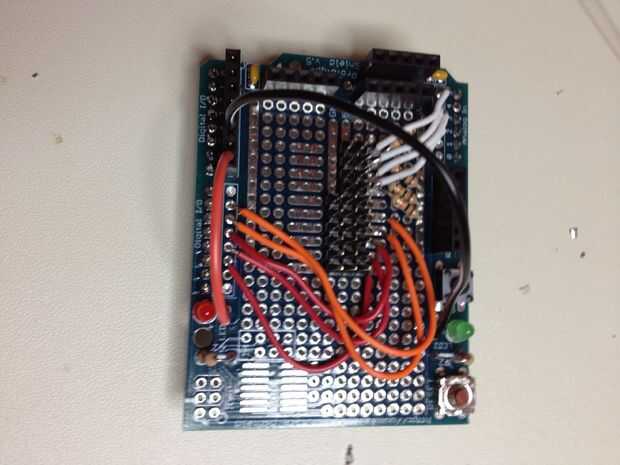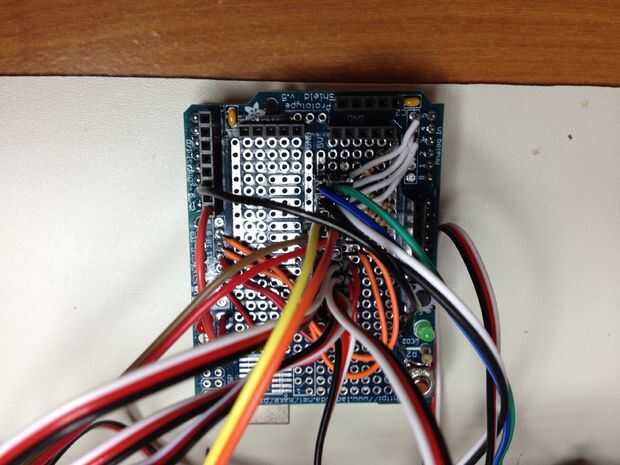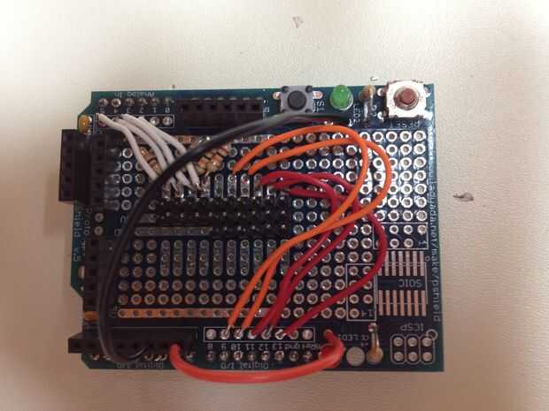 Nota: en la foto del anuncio que no soldadura las cabeceras de pin (que viene con el kit de proto) a los pines analógicos o el segundo banco de pines digitales. Estos dejé hacia fuera así que podría soldar los cables directamente a los cojines.
