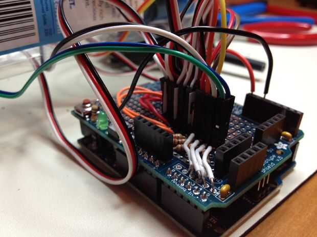 Considerando trabajar en el apretado espacio de la botella de agua Fiji, decidí que quería ser capaz de fácilmente conectar y desconectar todo (sensores, servos, etc.) de la placa Arduino. Por lo que he comprado un escudo de Proto, pernos breakaway masculinos y 6" hembra/hembra puente los cables de Adafruit. ¡ Soldar los pernos en el escudo de proto y todo lo conectado con puentes!