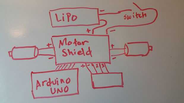 Esto es probablemente la parte más sencilla de la estructura. Bluetooth controlado por Arduino robots son bastante comunes. En esencia, sólo hay 6 partes simplemente conectadas. Hay un escudo de Adafruit motor que se encuentra en la cima de un Arduino UNO. Al escudo está engranado C.C. dos motores, un tablero de BlueSMiRF Bluetooth y una LiPo. El escudo está configurado (a través de un puente de conexión) para alimentación de tableros y los motores de la LiPo solo. Un pequeño interruptor se pone entre la LiPo y la Junta para que el bot puede fácilmente activar y desactivar. Y eso es todo. Personalmente, creo que esto es exactamente por qué es tan popular la plataforma Arduino. Simplifica el complejo.