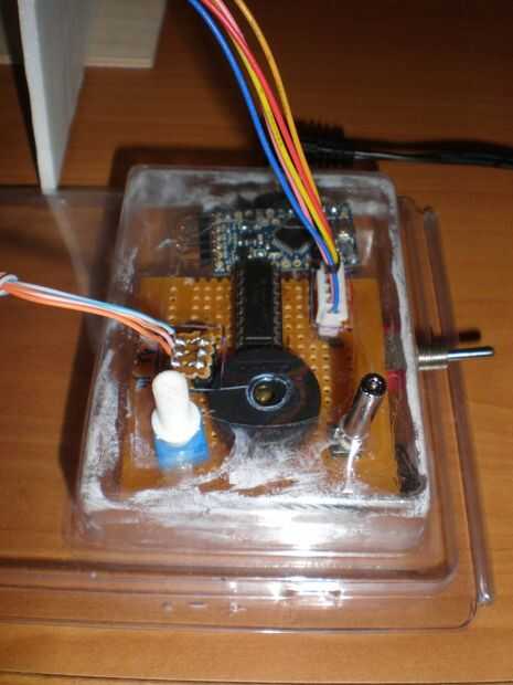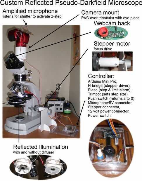 Una vez que tuve todas las piezas, montado el circuito en un Arduino Starter Kit (un juego maravilloso para aprender programación de Arduino). El motor paso a paso fue impulsado por un doble H puente de Adafruit (L293D, para esquema de ver https://learn.adafruit.com/adafruit-arduino-lesson-16-stepper-motors). Una vez que el circuito montado, recurrí a la programación. Básicamente, tomé el bosquejo de nivel de sonido de amplificador de micrófono de Adafruit y modificado para saber donde se encuentra, el paso a paso configurar el tamaño de paso midiendo una entrada y luego escuchar una señal lo bastante fuerte. Oyendo la señal, el controlador de vueltas el motor y da un pitido (como el paso a paso no se le fuera de rango, si así el dispositivo solo le dará el rango de alarma). A través de la fase de prueba, he encontrado que necesito usar 12V para obtener suficiente par que girar la perilla de enfoque de mi microscopio. Una vez que todo funciona correctamente todo lo puse en un circuito, había conectado a un Arduino Mini Pro y colocado en un caso (en realidad es el embalaje para el FDTI que necesitaba programar el Arduino Mini Pro). Imagen final muestra el sistema completo, incluyendo la fuente de iluminación usada para la proyección de imagen reflexiva pseudo-campo oscuro.