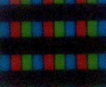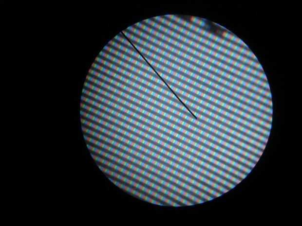Pero hay una manera muy sencilla para hacer esto. Tomar un teléfono o PDA cuya resolución conoces. En mi caso, mi Treo 700 P. Encenderlo y colocar bajo el microscopio. Tomar una imagen enfocada. Podrás ver los píxeles. Cada píxel está compuesto por tres subpíxeles: rojo, verde y azul. Midiendo el ancho de la pantalla, usted puede averiguar qué tan amplia es un subpíxel. (Cuando hablo de la anchura de los subpíxeles, incluir el espacio en un lado de él).