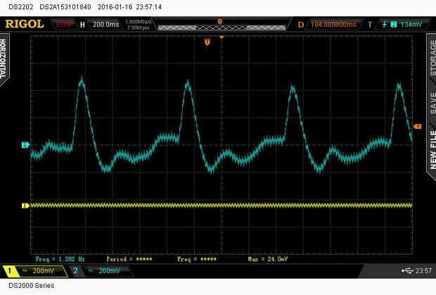 Para maximizar la salida de T2 está acoplado en el GND y + 5V carriles. El resistor de emisor R1 fue elegido empíricamente (aunque sea dentro de las fabricantes dedicados las características típicas para la luz corriente de colector) con el fin de dar la mejor respuesta. El emisor de T2 es que AC acoplada a IC1B y amplificador inversor a través de C2 condensador de cerámica de 1uF. El opamp TL07X fue elegido ya que tiene una etapa de entrada FET de alta impedancia y mínimamente carga a la salida del T2. IC1B proporciona amplificación de alta ganancia de la señal del fotodiodo. C3 se utiliza para proporcionar cierta atenuación de transitorios. La salida típica de este amplificador es dado arriba (nota la red 'ronquido' en la señal).