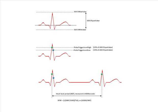 Estos valores máximos y mínimos se utilizan para determinar los puntos del disparador dinámico para detectar un borde agudamente de levantamiento en los latidos del corazón para permitir la sincronización del período entre pulsos y por lo tanto, calcular el valor de BPM.