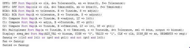 sseg_dec: Este proyecto utiliza un decodificador de siete segmentos, para mostrar información al usuario acerca de los valores actuales de la temperatura y los ajustes de los valores binarios almacenados en decimal fácilmente legible. La sseg_dec tiene 4 entradas: ALU_VAL(7 downto 0) (entrada número binario), signo (firmado), válido, CLK (reloj); y 2 salidas: DISP_EN(3 downto 0) (ánodos) de dígitos, SEGMENTS(7 downto 0). Este módulo fue proporcionada por nuestro instructor en el laboratorio y fue hecho por Bryan Mealy. En nuestro proyecto hemos utilizado números sin signo, para que muestra fue fijada a '0' y válido a '1'. Normalmente, el número binario de entrada se convierte en decimal codificado en binario, y luego los segmentos correcto y ánodos de dígitos están apagados, sin embargo para este proyecto que hemos cambiado la pantalla para ser completamente apagado si el número binario de entrada fue 0 conservar energía debe no hay nada que se muestre.