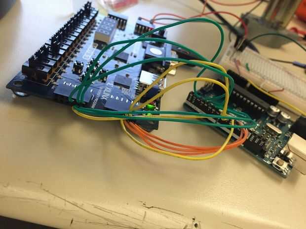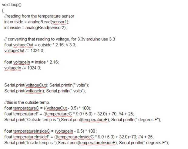 Montar un sensor en el apartamento y otro sensor fuera de lo aparente. Las entradas de tensión de los sensores se pueden leer los pines de entrada analógica de 0 y 2 en el arduino. Estos valores entonces se convierten a enteros de temperatura basado en una fórmula calibrada. Convierte la temperatura en un número binario y la salida a 6 diferentes pines de Arduino para cada sensor: