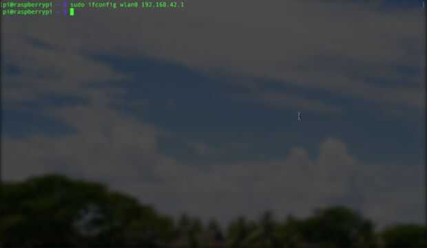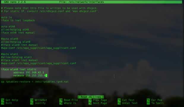 Encontrar la línea auto wlan0 y añadir luego una # delante de la línea y delante de cada línea. Si no tienes esa línea, sólo sudo ifconfig wlan0 192.168.42.1 parece seguro que la captura de pantalla abajo en el final! Básicamente sólo Quite cualquier vieja configuración de wlan0, va cambiando