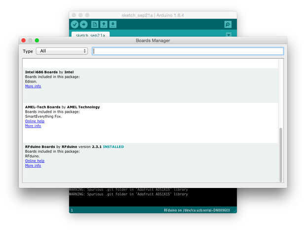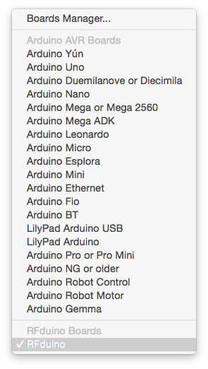 - Comprobar que "RFduino" es una de las entradas ahora bajo Herramientas > Junta