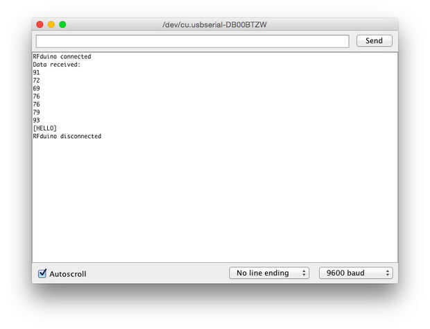 Como se ha visto en nuestro anterior Instructable, esto nos permite enviar y recibir comandos de forma interactiva. Los pasos siguientes son los comandos para conectar y escribir datos en el RFduino manteniendo un ojo en el Monitor Serial: