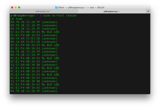 Donde el primer conjunto de caracteres alfanuméricos (hexagonales) corresponde a la dirección MAC de nuestra RFduino, y la cadena "Mi BLE LED" es el nombre del dispositivo que le asigna. Ahora que ya tenemos la dirección MAC, podemos utilizar para escribir datos en el RFduino.