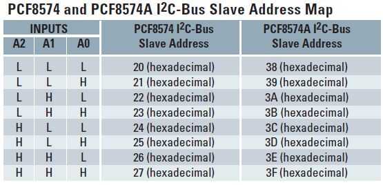 Mirar su expansión, luego consulte la tabla adjunta arriba. Entonces, si te ves 2ICs o más de una revisión (con un sufijo o sin), necesita cambiar direcciones. Puede dejar una de las mochilas con los cojines unbridged (usando la dirección HHH) y puente de diferentes combinaciones de cojines en todos los demás. Diferentes revisiones no entran en conflicto, así que si tienes dos adaptadores, uno con PCF8574 y PCF8574A otro, no conflicto independientemente de la combinación. También, esta cosa significa que podemos tener hasta 16 mochilas en un autobús si conectamos 8 tableros que tienen PCF8574 y 8 que tienen PCF8574A.