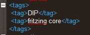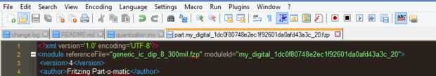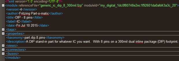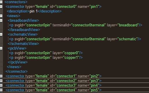 La sección de conector contiene todos los bolos que ha creado. Esta sección también tiene el nombre del pin como se relaciona la imagen .svg de la tabla. Al editar una pieza en el programa Fritzing tiene una manera especial de conectarse el código en el archivo de imagen. En lugar de cambiar el nombre de svgId en el código cambiará el nombre de la gráfica de la imagen svg. Cambiará el nombre a "conector #pin" donde # es el número del conector. Podemos manipular esto más adelante.