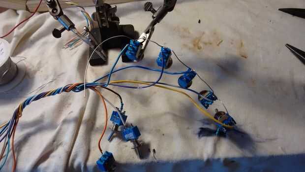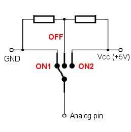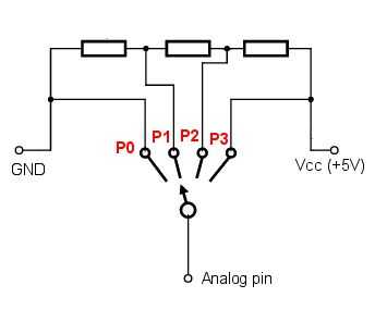 Por ridurre il numero di pin necessario su Arduino, por gli cambiar un posizioni tre ed me commutatori debido ho utilizzato pin analogici connessi al centrale, e partitori resistivi por realizzare valori di tensione diversi a seconda della posizione dello interruptor o commutatore (vedi figura).