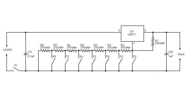 Turing interruptor 1 enciende el circuito y trae la salida hasta 1.25V. Luego con los interruptores de 2 a 8, apagar los interruptores en orden cada uno aumentará el voltaje de salida aproximadamente 1,53 voltios.