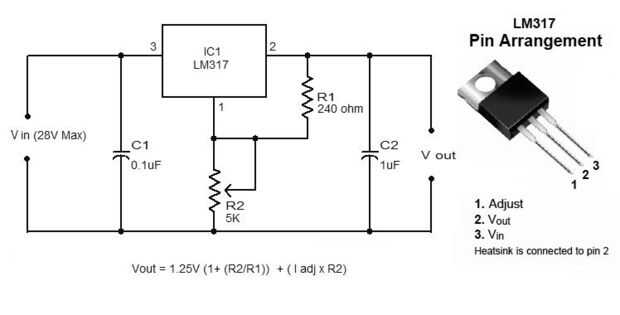 Puesto que Iadj es pequeña (sobre 0.1 mA), la fórmula puede simplificarse a Vout = 1.25V x (1 + (R2/R1)) como R1 también es relativamente pequeño. Debido a esto, R1 se mantiene generalmente a cerca de 240 ohmios (se puede sustituir una resistencia de 220 ohm). R2 se selecciona entonces para obtener el voltaje de salida deseado. A menudo un una resistencia variable se utiliza para R2 para hacer el circuito ajustable.