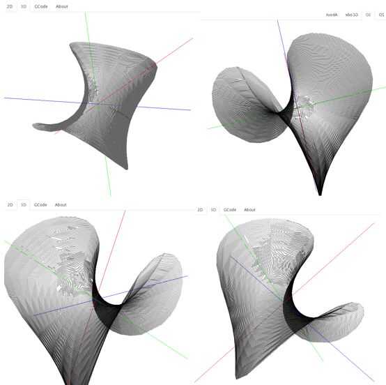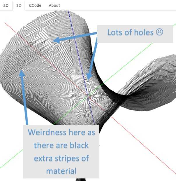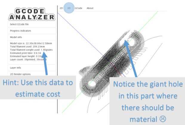 Modo 3D muestra un modelo 3D de las trayectorias de cada capa. Parece un poco extraño al principio, pero te acostumbras pronto. Lo más importante es rotar y zoom para obtener todos los ángulos que puede detectar los errores. A continuación se muestran ejemplos de lo que tratan de detectar.