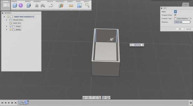 Después, seleccioné el interior los bordes en un extremo del agujero y utilizado modificar > chaflán a sacarlos como esquinas, utilizando el valor de x (aproximadamente 7.615 mm).