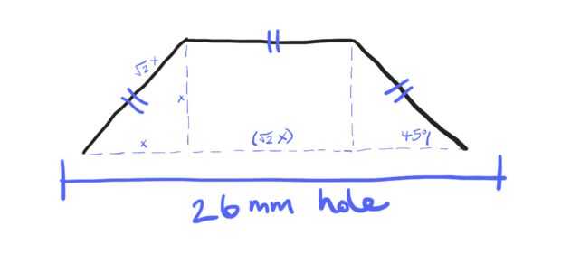 - La anchura interior del agujero es de 26mm, y se compone de dos triángulos de la derecha y un rectángulo. Longitud del rectángulo es igual a la hipotenusa de cada triángulo.