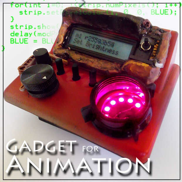 Esta guía muestra cómo hacer un cinco-entrada auxiliar-gadget para diseñar animaciones en NeoPixels. Display muestra los valores RGB y otros datos. Permite seleccionar entre una colección de animaciones y afinarlos de color, velocidad, dirección o cualquier otra variable programa.