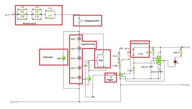 También pasé por un montón de esquemas diferentes. Lo que originalmente no darse cuenta tuvo que supercondensadores clasificaciones de voltaje inferiores, así que mi primer circuito podría bombear sobre 37kA. También estaba consciente del hecho de que este valor de corriente probablemente podría derretir cualquier cable que pude tener en mis manos y por supuesto, el cable tendría que ser increíblemente gruesas para tener una baja resistencia para permitir que esta corriente pase a través de él. Uso de Yenka pude trabajar a través de varios diseños para llegar a un circuito analógico relativamente simple que me permita cargar y cambiar los capacitores, así como un circuito de detección que podría cambiar la bobina de este momento que el proyectil alcanza el final de la bobina. Esto puede haber sido más fácil hacerlo con un microcontrolador, ya que eso es lo que mucha gente acaba metiendo electrónica utiliza, pero prefiero utilizar electrónica analógica siempre que sea posible.