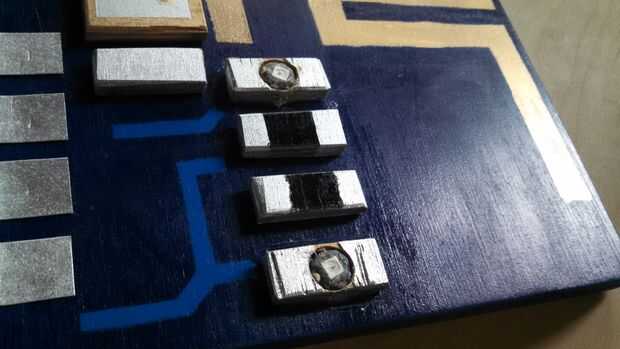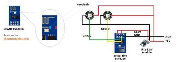 ESP tiene 2 a bordo de LEDs. azul para el rojo para la energía y conectividad wifi. nos escondiendo neopixel rgb LEDs dentro de nuestro marco de madera para una apariencia realista...