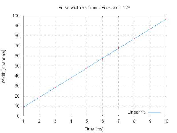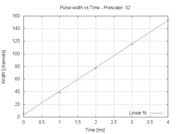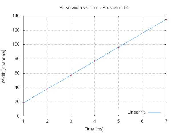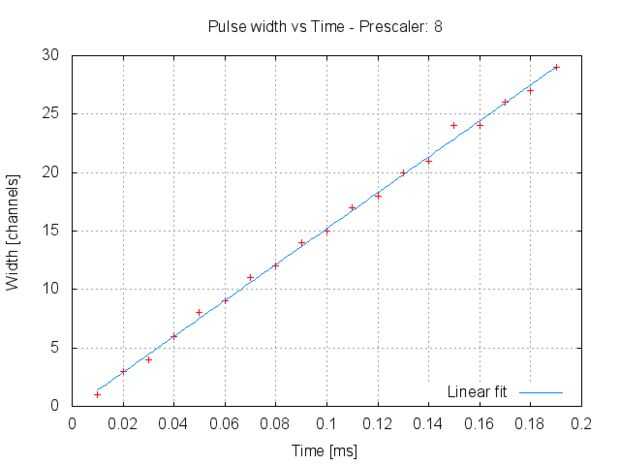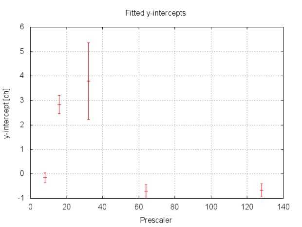 Mientras que de la trama de "Montar y-intercepta" obtenemos una idea de la linealidad del sistema. Todas las intersecciones y deben ser cero porque en una señal con longitud cero debe corresponder un pulso con una longitud cero. Como podemos ver en el gráfico todos son compatibles con el cero, pero no el conjunto de datos 18-prescaler. Este conjunto de datos, sin embargo, es el peor porque es tiene solo dos datos y su calibración no se puede confiar.
