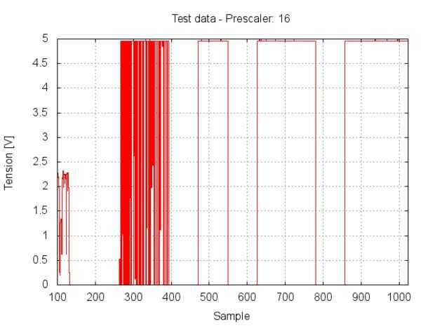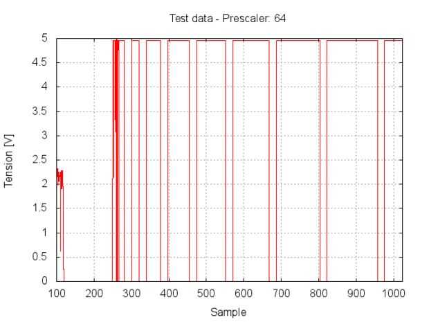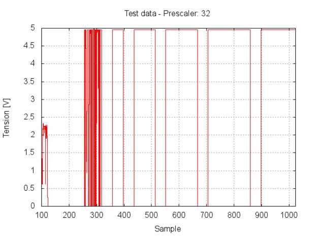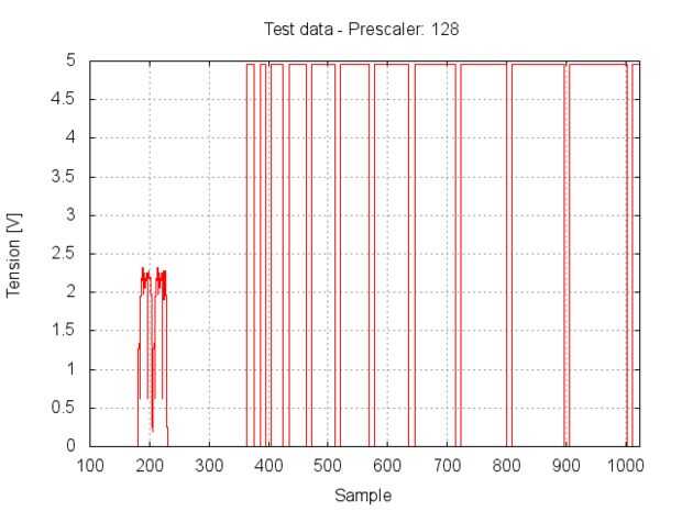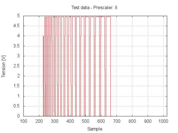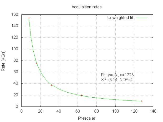 En las imágenes podemos ver todos los datos que tomé un analizados. La trama de "las pistas de integral" es el más interesante porque nos dice la tasa de adquisición real de mi sistema, en cada ajuste divisor. Las pistas fueron medidas como número [ch/ms] pero esto es equivalente a una [kHz], por lo que los valores de pendientes son realmente kHz o también kS/s (kilo muestras por segundo). Eso significa que con el prescaler a 8 de que obtenemos una tasa de adquisición:
