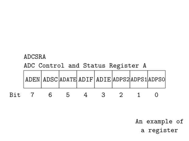 Los registros tienen algunos nombres que se especifican en la hoja de datos dependiendo de su significado, como ADCSRA para el registro de configuración del ADC: A. También cada poco significativa de los registros tiene un nombre, como ADÉN para la ADC activar Bit en el registro ADCSRA.