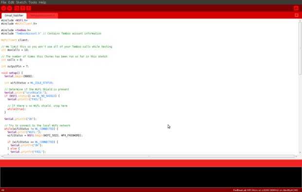 #include <WiFi.h>#include <WiFiClient.h>#include <Temboo.h>#include "TembooAccount.h" // Contains Temboo account informationWiFiClient client;// We limit this so you won't use all of your Temboo calls while testing int maxCalls = 50;// The number of times this Choreo has been run so far in this sketch int calls = 0;int outputPin = 7;void setup() { Serial.begin(9600); int wifiStatus = WL_IDLE_STATUS; // Determine if the WiFi Shield is present Serial.print("\n\nShield:"); if (WiFi.status() == WL_NO_SHIELD) { Serial.println("FAIL"); // If there's no WiFi shield, stop here while(true); } Serial.println("OK"); // Try to connect to the local WiFi network while(wifiStatus != WL_CONNECTED) { Serial.print("WiFi:"); wifiStatus = WiFi.begin(WIFI_SSID, WPA_PASSWORD); if (wifiStatus == WL_CONNECTED) { Serial.println("OK"); } else { Serial.println("FAIL"); } delay(5000); } // Initialize pins pinMode(outputPin, OUTPUT); Serial.println("Setup complete.\n"); }void loop() { if (calls < maxCalls) { Serial.println("Calling GetUnreadMail Choreo..."); runGetUnreadMail(); calls++; } else { Serial.println("Skipping to save Temboo calls. Adjust maxCalls as required."); } delay(60000); }void runGetUnreadMail() { TembooChoreo GetUnreadMailChoreo(client); // Set Temboo account credentials GetUnreadMailChoreo.setAccountName(TEMBOO_ACCOUNT); GetUnreadMailChoreo.setAppKeyName(TEMBOO_APP_KEY_NAME); GetUnreadMailChoreo.setAppKey(TEMBOO_APP_KEY); // Set profile to use for execution GetUnreadMailChoreo.setProfile("GmailProfile"); // Identify the Choreo to run GetUnreadMailChoreo.setChoreo("/Library/Google/Gmail/GetUnreadMail"); // Run the Choreo unsigned int returnCode = GetUnreadMailChoreo.run(); // A return code of zero means everything worked if (returnCode == 0) { while (GetUnreadMailChoreo.available()) { String name = GetUnreadMailChoreo.readStringUntil('\x1F'); name.trim(); String data = GetUnreadMailChoreo.readStringUntil('\x1E'); data.trim(); if (name == "FullCount") { if (data.toInt() >= 1) { digitalWrite(outputPin, HIGH); } else{ digitalWrite(outputPin, LOW); } } } } GetUnreadMailChoreo.close(); } 2. TembooAccount.h