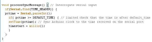 setTime(pctime); Sincronizar reloj de Arduino a la vez que recibe en el puerto serie